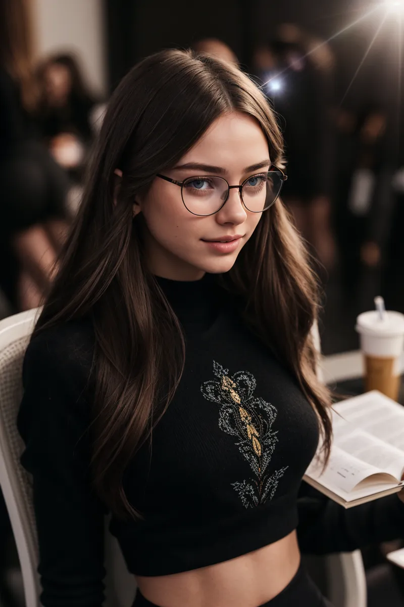 (CINEMATIC SHOT:1.4)(Packed College Study Hall:1.4) The 22 year old TrualityCampus_Penelope (Brunette Hair.1.3)(Black Leggings and a Sweater:1.4)((Photo Focus, DOF, Aperture, insanely detailed and intricate, character, hypermaximalist, elegant, ornate, beautiful, exotic, revealing, appealing, attractive, amative, hyper realistic, super detailed, (lens flare:1.1) heresy flares)) (Wearing glasses:1.4) (studying:1.4) <lora:people_count_slider_v1:4>