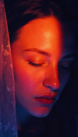 Ein eindrucksvolles High-Fashion-Nahaufnahmeportrait einer Frau, die in einen schwarzen Niqab gehüllt ist, vor einem kräftigen, tiefroten Hintergrund. Das Bild ist dramatisch beleuchtet, betont die Textur des Stoffs und den durchdringenden Blick der Frau.