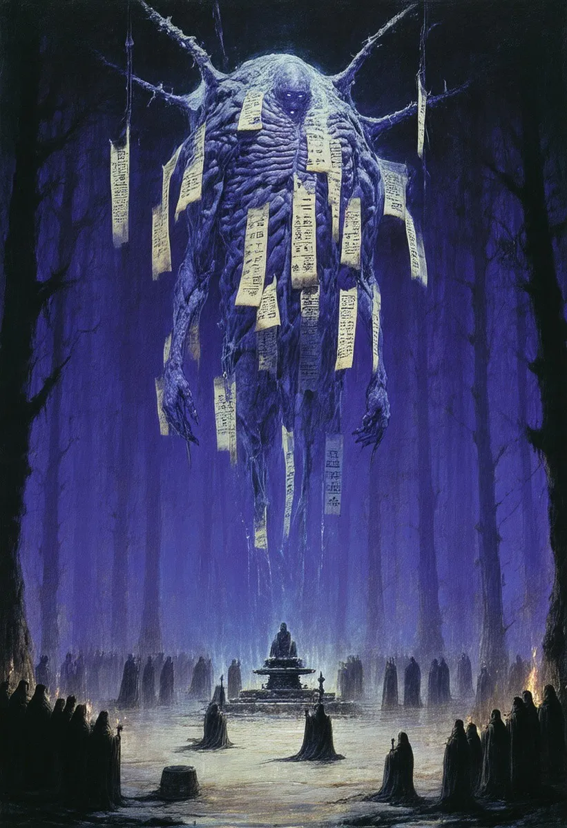 A large, bloated creature floats mid-air, its body draped with numerous hanging parchment strips inscribed with mysterious writings and sealed eyes embedded within its flesh. The creature's skin is adorned with vanishing symbols or tattoos. Below it lies a void altar bathed in a misty glow, ringed by robed, whispering monks forming a circle. The setting is within a dark alien forest featuring tall, shadowy trees fading into deep blues and purples. The scene is rendered in an oil painting style characterized by thick brushwork and an atmosphere dense with smoke and an aura of unspoken curses. Contrasting colors include glowing ivory and ink black, emphasizing the eerie, mystical ambiance.
