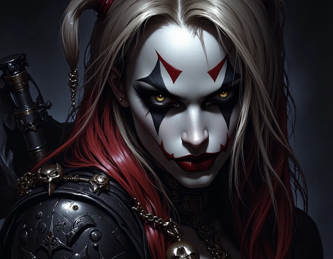 Harley Quinn is depicted with striking white face paint featuring red and black geometric designs around her eyes and mouth, evoking a dark fantasy theme. Her intense yellow eyes pierce through the dramatic chiaroscuro lighting, which highlights one side of her face, enhancing the high detail and texture of her skin and makeup. Her hair transitions from platinum blonde to deep red at the ends, styled in pigtails with metallic ornaments. She wears intricate dark armor adorned with skull motifs and chains, adding to the ominous and fantastical atmosphere. The composition is perfectly balanced to capture a powerful and intense expression.