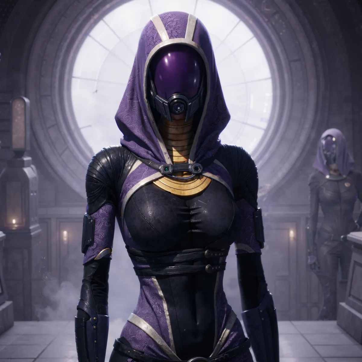 Tali Zorah is depicted in a futuristic, sci-fi setting, wearing a tight, detailed purple hooded outfit combined with black and metallic armor elements. Her helmet is smooth and reflective with a central breathing apparatus, emphasizing a cybernetic aesthetic. The background features a large circular window emitting bright light, adding a dramatic ambiance to the scene. The composition resembles a movie poster emphasizing Tali as the sole primary character, exuding a powerful and enigmatic presence. Additional hooded figures in the background complement the theme, and the architectural elements suggest a high-tech, advanced environment. The blend of purple tones, gold accents, and dark armor highlights the character’s distinctive style.