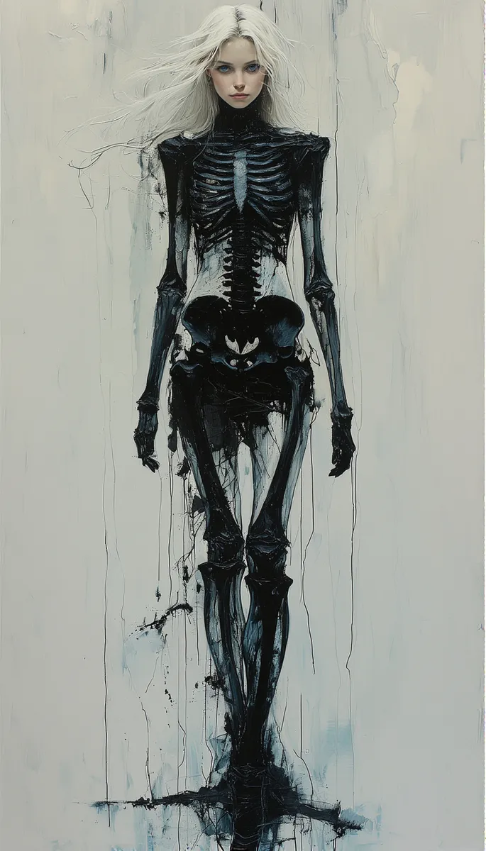 Młoda kobieta stawia krok do przodu, ubrana w ciasno gorsetową, futurystyczną sukienkę wykonaną z czarnych kości i metalu, stylizowaną na szkielet. Ma przezroczystą, bladą białą skórę, wyraziste niebieskie oczy i długie, opadające białe włosy. Dzieło wykonane jest techniką wielowarstwowego malarstwa olejnego, tworząc wyraźne tekstury i poczucie głębi dzięki różnym gęstościom ciemnych tonów. Kompozycja skupia postać na gładkim, stonowanym tle z rozproszonym chłodnym oświetleniem, wywołując tajemniczą atmosferę. Styl łączy abstrakcyjny realizm z ekspresjonizmem, czerpiąc inspiracje od Gigera, Ernsta Haeckela, Johna Singera Sargenta i Rembrandta, charakteryzując się skomplikowanymi liniami i delikatnymi, ostrymi detalami. Całościowy efekt jest romantyczny, ale dynamiczny, z gesturalnymi pociągnięciami oddającymi ruch przy zachowaniu bogatych detali.