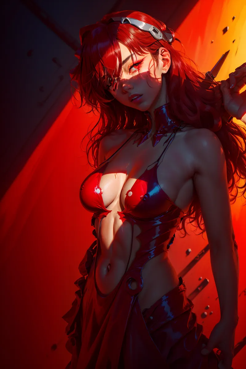 Asuka Langley é retratada em um retrato hiper-detalhado e em alta resolução vestindo um traje vermelho do Evangelion brilhante e intrincadamente detalhado. Seu longo cabelo vermelho fluido é iluminado por uma luz dramática que passa pelos fios, projetando sombras marcantes em seu rosto. A composição utiliza um ângulo dinâmico com um fundo escuro contrastado por tons vibrantes de vermelho e laranja, criando uma imagem com estilo marcante de fotografia de moda. A pose da personagem é dinâmica e confiante, enfatizando as superfícies finamente texturizadas e o material brilhante do traje. As sombras profundas, o efeito bokeh e os elementos sutis de silhueta aprimoram a atmosfera misteriosa geral, enquanto o uso de técnicas de iluminação estilística do modelo 'DarkLighting' acrescenta sofisticação e qualidade artística à imagem.