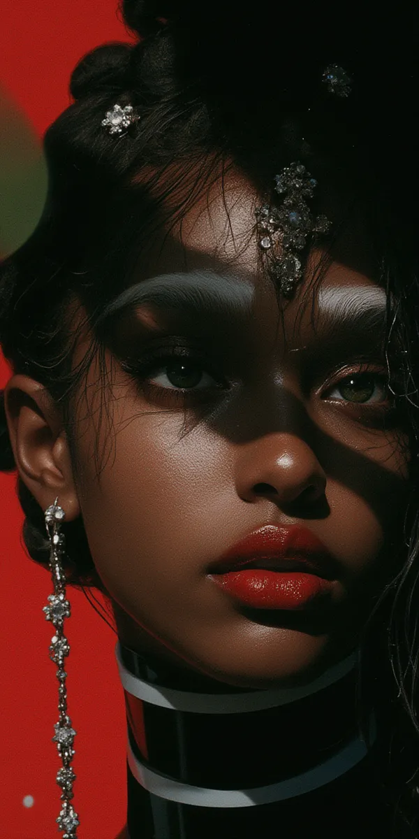 POC, gem touch, clear\_note with subtle film-grain texture, vintage atmosphere, and light rays, clear\_note with intricate overlay of luminous radiant white line art emphasizing the subject by tracing the detail on their figure; high-contrast portrait of a dark-skinned person with glossy smooth skin, sculptural afro topknot with tightly coiled strands and framing curls, adorned with rhinestone diamond stimulant ornaments across forehead, ears, and within the hair; intense red background with harsh directional lighting casting bold shadows and highlights, minimalist composition with focus on facial features, hair texture, and sparkling accents.